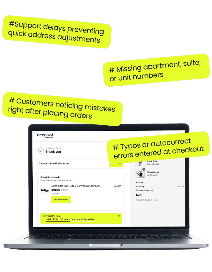 Account Editor gives customers fast, secure ways to edit shipping addresses after checkout , without contacting support and without affecting payment status or fulfillment workflows.